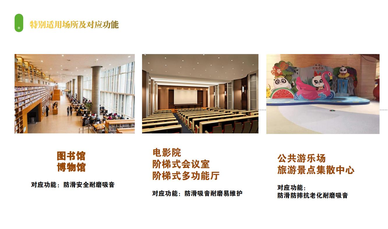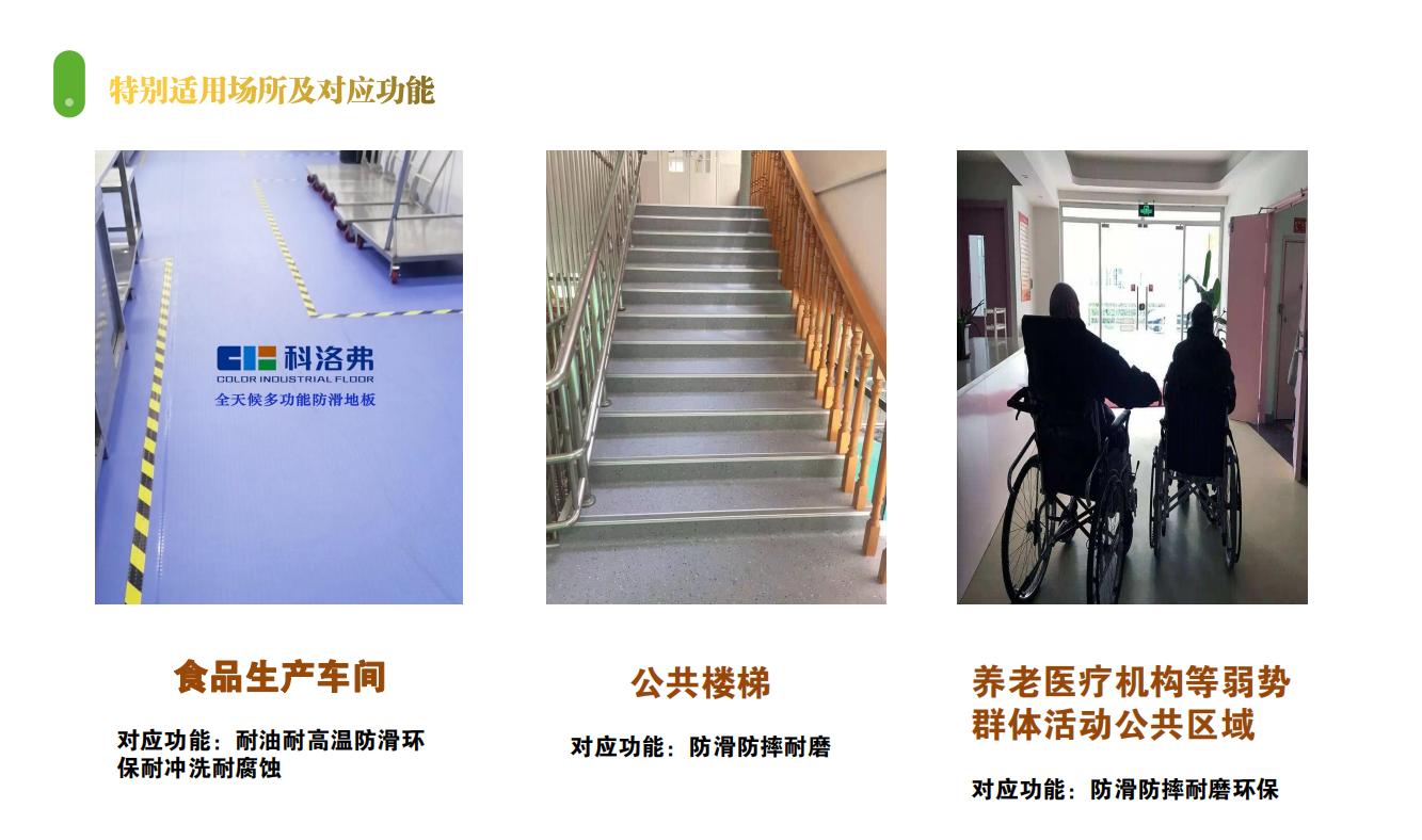 特別適用特點:1、超強防滑防摔性(360度雙重防滑專利設計、3.7mm實心高彈力納米材料結構),可防止摔倒時地面對人體產生的物理傷害。2、綠色環保,無毒無味且防霉抗菌,為老人小孩提供安全舒適的生活環境。3、超級耐磨,可保證15年以上的超長使用壽命。4、高回彈性保證了地面的高度舒適性,可減緩因行走而對人體產生的疲勞度。5、非發泡類地面材料,可支撐重物壓力,不影響輪椅推車通行,不產生壓痕